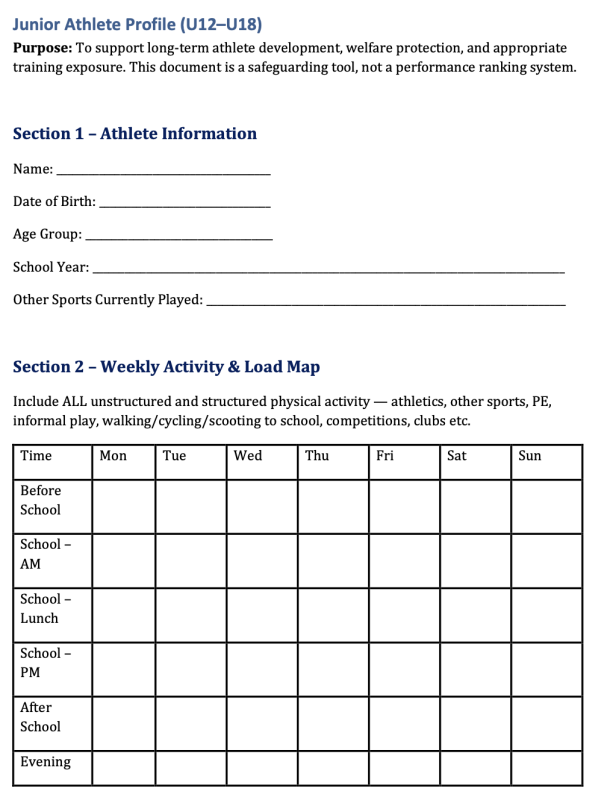 Over the next year, coaches will begin completing Junior Athlete Profiles for athletes in the U12–U18 age groups. These will be reviewed periodically and used to guide sensible, age-appropriate training decisions, discussed and agreed with parents.