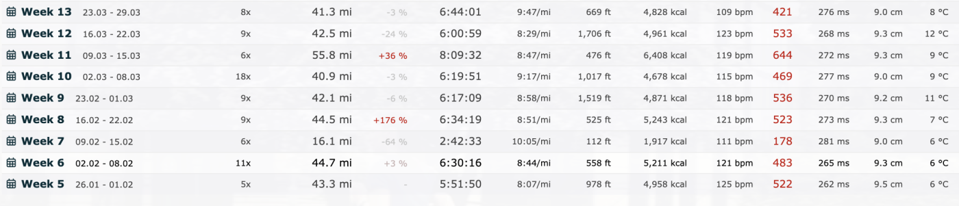 March has been my biggest mileage month for a very long time. Probably my biggest since before Boston 2022. I’ve managed to string together eight 40 mile weeks with just one dip with illness since the start of February. Two more 40 mile weeks in April and I will be happy to be more or less on track again for 2026 miles in 2026.